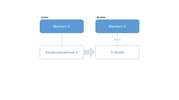 Die Einbringung kann dabei auf eine bestehende aber auch neu zu gründende GmbH erfolgen. Sämtliche Vermögensgegenstände inkl. laufender Verträge und Schulden des Einzelunternehmens gehen mit Wirksamkeit der Umwandlung kraft Gesetz auf die A-GmbH über (sogenannte Gesamtrechtsnachfolge).